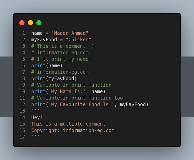 قمنا أيضاً بعمل تعليق ليوضح ما نكتبه, والضي شرحناه فى المقالة السابقة أيضاً بعد ذلك قُمنا بطباعة الاسم , سيكون الناتج هو القيمة المخزنة به وهي Nader Ahmed بعد ذلك قمنا بكتابة تعليقات أُخري, ثم بعد ذلك قمنا بكتابة print(myFavFood) وهذا لطباعة القيمة المخزنة بداخل المتغير myFavFood وبالطبع سيكون الناتج, هو Chicken.